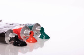 Dwie otwarte rurki z farbą akrylową w kolorze czerwonym i czarnym odbijające się na powierzchni stołu