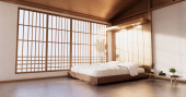 Biały pokój japoński projekt na tropikalnym wnętrzu pokoju i podłogi matowej tatami. Renderowanie 3D