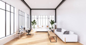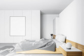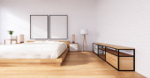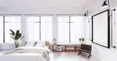 Sypialnia stylu poddasze z komputerem i narzędziem biurowym na biurku. Renderowanie 3D