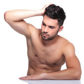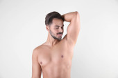 Młody mężczyzna pokazuje bezwłose pachy po zabiegu depilacji na białym tle