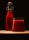 Świeży sok pomidorowy w szklance ze świeżymi liśćmi bazylii i pomidorami na drewnianym stole..