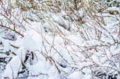 Cierniowe gałęzie przyciętych krzewów pokryte są świeżym śniegiem. Kopiuj tło przestrzeni