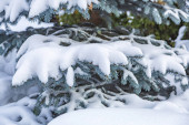 Śnieg na zielonych gałęziach świerku podczas opadów śniegu. Zielone gałęzie choinki pokryte białym śniegiem w śniegu. Naturalne tło zimowe