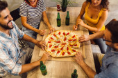 Grupa szczęśliwych przyjaciół robi imprezę w domu, je pizzę i dobrze się bawi.