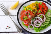 Sałatka warzywna z pomidorami, czerwoną cebulą i sosem na czarnym tle.