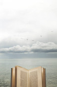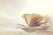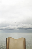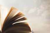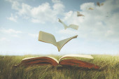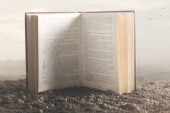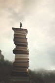 mądry i odnoszący sukcesy człowiek spogląda w dół z góry surrealistycznej sterty książek