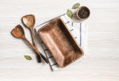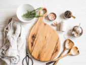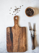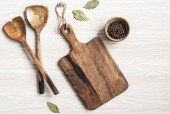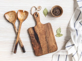 Kuchnia gotowanie płaskie leżał. Przyprawy, łyżki do drewna i deska do cięcia drewna do umieszczenia tekstu na jasnym tle drewna. Widok góry. przestrzeń kopiowania