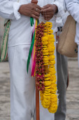 Cztery osoby rozmawiają ze sobą przy stole z kolorowymi kwiatami wyświetlanymi na stole w Varkala, Kerala, Indie