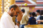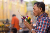 Mężczyzna modlący się przy fontannie trzymając zielony kwiat
