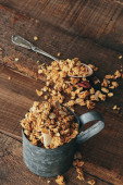 Domowej roboty granola w słoiku w stylu rustykalnym z drewnianym tłem. Zdrowa koncepcja posiłków wegańskich.