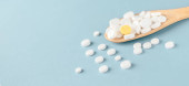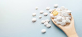 Zdjęcie "Szczelnie białe tabletki, tabletki w drewnianej łyżeczce na niebieskim stole. Koncepcja medycyny i zdrowia. farmaceutyków. Widok góry. Tabletki i witaminy" może być wykorzystywane do celów osobistych i komercyjnych zgodnie z warunkami zakupionej licencji Royalty-free. Obraz jest dostępny do pobrania w jakości wysokiej rozdzielczości do 5760x3840.