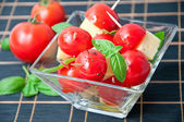 mozzarellą, pomidorami i bazylią świeżych liści na białym tle