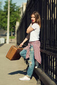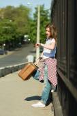 młoda kobieta trzyma plakietkę z napisem podróży w podniesionych rękach stojąc w pobliżu zabytkowego samochodu kabrioletowego