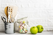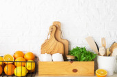 Kuchenna półka ze sztućcami, łyżeczkami, łopatkami, świeżą bazylią, deskami do krojenia, świeżymi warzywami, cytryną na prostej ścianie. Poziomy, przestrzeń,