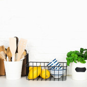 Zdjęcie "Kuchenna półka ze sztućcami, łyżeczkami, łopatkami, świeżą bazylią, deskami do krojenia, świeżymi warzywami, cytryną na prostej ścianie. Poziomy, przestrzeń," może być wykorzystywane do celów osobistych i komercyjnych zgodnie z warunkami zakupionej licencji Royalty-free. Obraz jest dostępny do pobrania w jakości wysokiej rozdzielczości do 5760x3840.