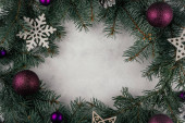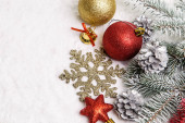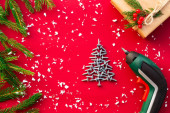 Choinka wykonana ze śrub samogwintujących, prezent w papierze rzemieślniczym z gałązkami choinki i czerwonymi jagodami na czerwonym tle. Leżeć płasko. Przestrzeń kopiowania.