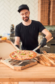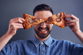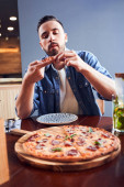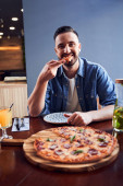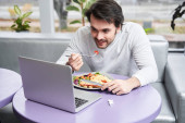Mężczyzna z laptopem w jedzeniu pizzy w miejscu pracy