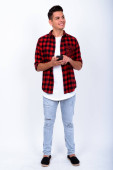Studio strzał młody przystojny mężczyzna noszenie stylowe ubrania na szarym tle w czerni i bieli