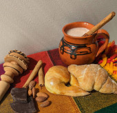 Tradycyjny meksykański chleb zmarłych, pan de muerto, z kawą