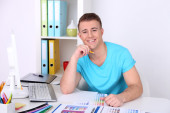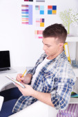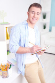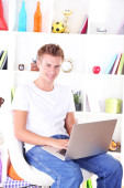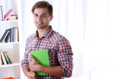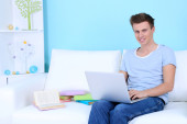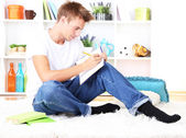 młody człowiek leży na dywanie i studia, na tle wnętrz domu