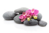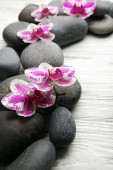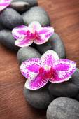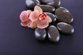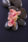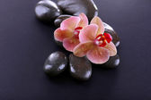 Kompozycja z pięknych kwitnących orchidei z kropli wody i spa kamienie, na czarnym tle