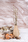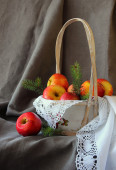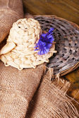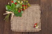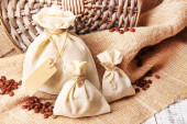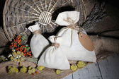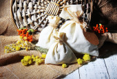 włókienniczych saszetka etui z suszonych kwiatów, ziół i jagód na drewnianym stole, na tle worze