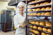 Pracownik piekarz kobieta w białym mundurze gospodarstwa gorący chleb bagietka w rękach w piekarni, tło linii produkcyjnej żywności