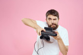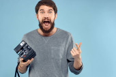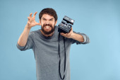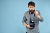 mężczyzna fotograf gospodarstwa aparat profesjonalny obiektyw kreatywne studio pracy światło tło