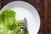 dieta monotroficzna - dwa liście sałaty na talerzu, widelec i nóż, tło drewniane
