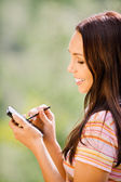 Zdjęcie "Młoda blondynka pisze na komputerze pocket" może być wykorzystywane do celów osobistych i komercyjnych zgodnie z warunkami zakupionej licencji Royalty-free. Obraz jest dostępny do pobrania w jakości wysokiej rozdzielczości do 5760x3840.