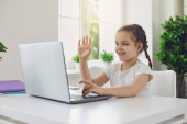 Dzieciak od edukacji online. Dziecko w słuchawkach oglądanie lekcji wideo na laptopie i robienie notatek w domu