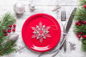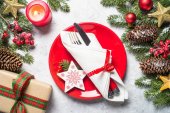 Zdjęcie "Stół świąteczny miejsce ustawienie z pustym białym talerzem, laski cukierki, gałąź jodły i sztućce z świątecznych dekoracji na tle kamienia - Obraz" może być wykorzystywane do celów osobistych i komercyjnych zgodnie z warunkami zakupionej licencji Royalty-free. Obraz jest dostępny do pobrania w jakości wysokiej rozdzielczości do 5760x3840.