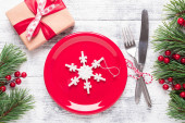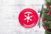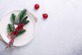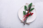 Stół świąteczny miejsce ustawienie z pustym białym talerzem, laski cukierki, gałąź jodły i sztućce z świątecznych dekoracji na tle kamienia - Obraz