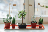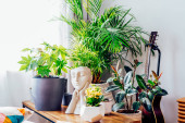 Zdjęcie "Rośliny doniczkowe ustawione na macie na podłodze w salonie. Niski kąt." może być wykorzystywane do celów osobistych i komercyjnych zgodnie z warunkami zakupionej licencji Royalty-free. Obraz jest dostępny do pobrania w jakości wysokiej rozdzielczości do 5760x3840.