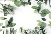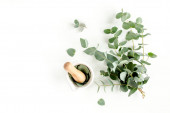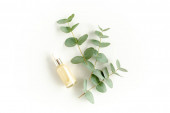Butelka olejku eukaliptusowego, liście eukaliptusa na białym tle. Naturalne kosmetyki ekologiczne. Płaskie ułożenie, widok z góry.