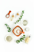 Butelka olejku eukaliptusowego, liście eukaliptusa na białym tle. Naturalne kosmetyki ekologiczne. Płaskie ułożenie, widok z góry.