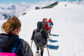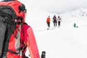 Punkt widzenia członków zespołu linowego z alpinistami spacerującymi po śniegu i lodzie w słoneczną pogodę.