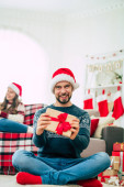 Zamknij zdjęcie pięknej młodej szczęśliwej uśmiechniętej kobiety w świątecznym swetrze i kapeluszu Mikołaja trzyma pudełko prezentów w rękach w domu na tle jej przyjaciół i choinki.