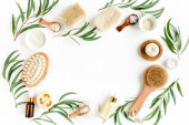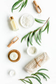 Uzdrowisko. Naturalne, ekologiczne kosmetyki spa, ekologiczne akcesoria łazienkowe, liście eukaliptusa. Koncepcja pielęgnacji skóry na białym tle.