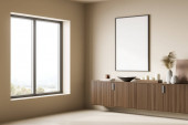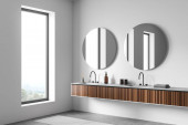 Zdjęcie "Narożnik przestronnej łazienki z białymi i drewnianymi ścianami, betonową podłogą i podwójnym zlewem z owalnymi lustrami. 3d renderowanie" może być wykorzystywane do celów osobistych i komercyjnych zgodnie z warunkami zakupionej licencji Royalty-free. Obraz jest dostępny do pobrania w jakości wysokiej rozdzielczości do 5760x3840.