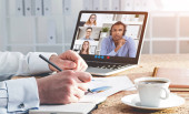Zdjęcie "Wesoły młody Afroamerykanin biznesmen mający wideokonferencję ze swoimi różnorodnymi kolegami. Nowoczesny komputer na białym stole. Koncepcja pracy z domu w czasie pandemii jelita grubego 19" może być wykorzystywane do celów osobistych i komercyjnych zgodnie z warunkami zakupionej licencji Royalty-free. Obraz jest dostępny do pobrania w jakości wysokiej rozdzielczości do 5760x3840.