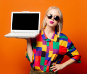 Stylowa blondynka w ubraniach z lat 90-tych z notatnikiem i okularami VR na pomarańczowym tle