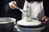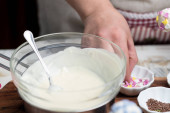 Lady robi ciasto krem za pomocą elektrycznej przenośnej maszyny mikserskiej