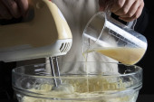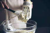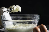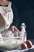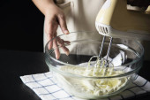 Lady robi ciasto krem za pomocą elektrycznej przenośnej maszyny mikserskiej