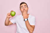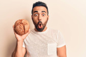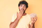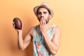 Młody Hiszpan, trzymający melona zakrywającego usta ręką, zszokowany i bojący się pomyłki. zaskoczona ekspresja