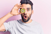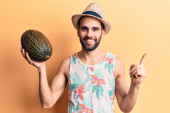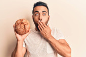 Zdjęcie "Młody Hiszpan, trzymający melona zakrywającego usta ręką, zszokowany i bojący się pomyłki. zaskoczona ekspresja " może być wykorzystywane do celów osobistych i komercyjnych zgodnie z warunkami zakupionej licencji Royalty-free. Obraz jest dostępny do pobrania w jakości wysokiej rozdzielczości do 5760x3840.