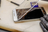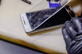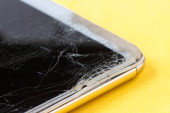 Makro zdjęcie żółtego telefonu komórkowego z zepsutym wyświetlaczem z rozbłyskiem
