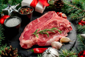Zdjęcie "Surowe steki z wołowiny ribeye do przygotowania kolacji dla dwojga na święta Bożego Narodzenia na kamiennym stole z choinką i dekoracjami" może być wykorzystywane do celów osobistych i komercyjnych zgodnie z warunkami zakupionej licencji Royalty-free. Obraz jest dostępny do pobrania w jakości wysokiej rozdzielczości do 5760x3840.
