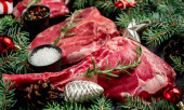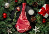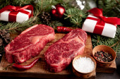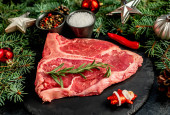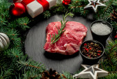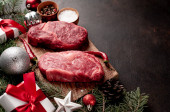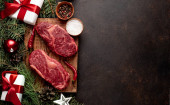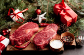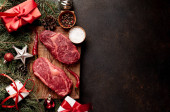 Surowe steki z wołowiny ribeye do przygotowania kolacji dla dwojga na święta Bożego Narodzenia na kamiennym stole z choinką i dekoracjami