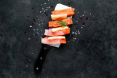 grillowany stek łososiowy ze składnikami nad nożem mięsnym na kamiennym tle